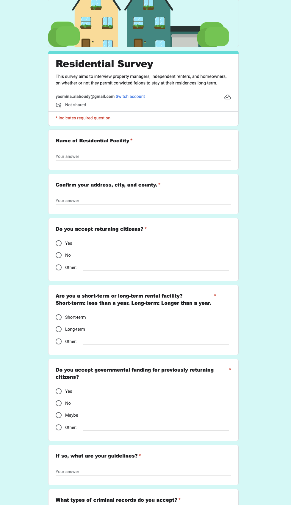 The next step involved data collection, during which team members directly contacted property managers and owners to gather detailed information about their housing policies. This was achieved through phone calls and emails, guided by carefully crafted scripts. The team used a structured residential survey designed in collaboration with USAGAN to ensure that all relevant topics were addressed. The survey included questions about felony acceptance criteria, housing types, residency duration, costs, and additional restrictions or regulations. If property managers preferred, pre-written emails containing the survey link were sent to gather responses efficiently.